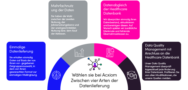 Our address database includes data from all doctors, dentists, pharmacies, clinics, retirement and nursing homes, healthcare providers and other healthcare stakeholders in Germany, Austria and Switzerland. Thanks to the high depth of information, the target groups can also be selected according to disciplines, additional training, occupational groups, age, focus areas and much more. Acxiom always provides you with the entire title with first and last name. This data can also be combined with information on population, age structure, households, employment and purchasing power at all postal, administrative and fine-grained levels. Another advantage is Acxiom’s geo-targeting with diagnostic potential. These can be combined with sociodemographic, economic and spatial data at the microcell level.
