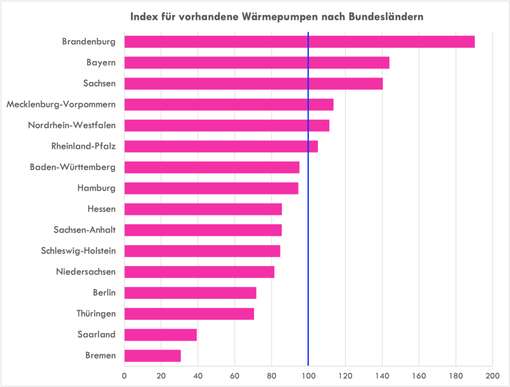 Ranking der Bundesländer nach Dichte installierter Wärmepumpen (Index, Deutschland = 100)